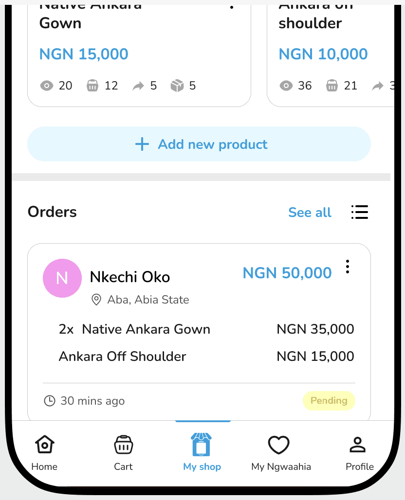 The seller decides which delivery options will be available for a product. Most sellers allow a combination of pickup by buyer, delivery by seller, and waybill/long-distance shipping. Ngwaahia has features that will help the seller process the order faster and update the customer as the order progresses.